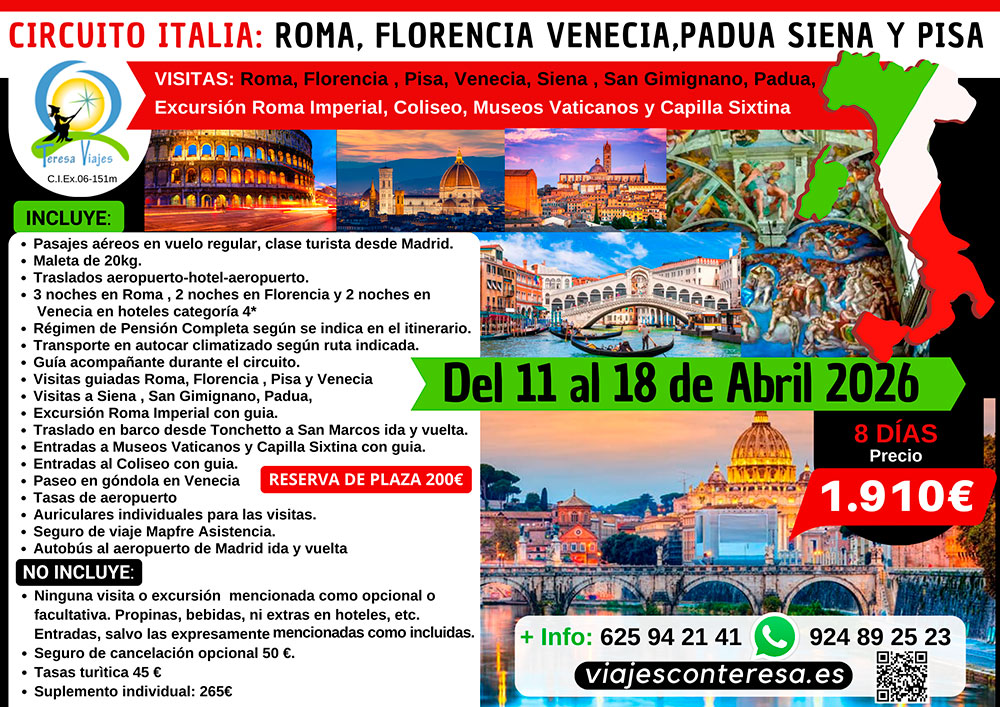 • Visitas guiadas Roma, Florencia, Pisa y Venecia
