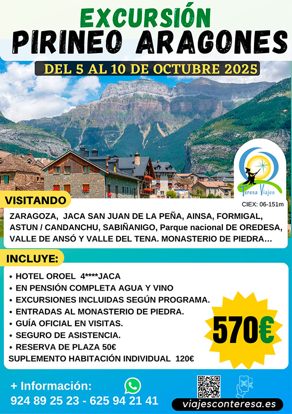 • VISITANDO: Zaragoza, Jaca, San Juan de la Peña, Aínsa, Formigal, Astún / Candanchú, Sabiñánigo, Parque Nacional de Ordesa, Valle de Ansó y Valle del Tena. Monasterio de Piedra…